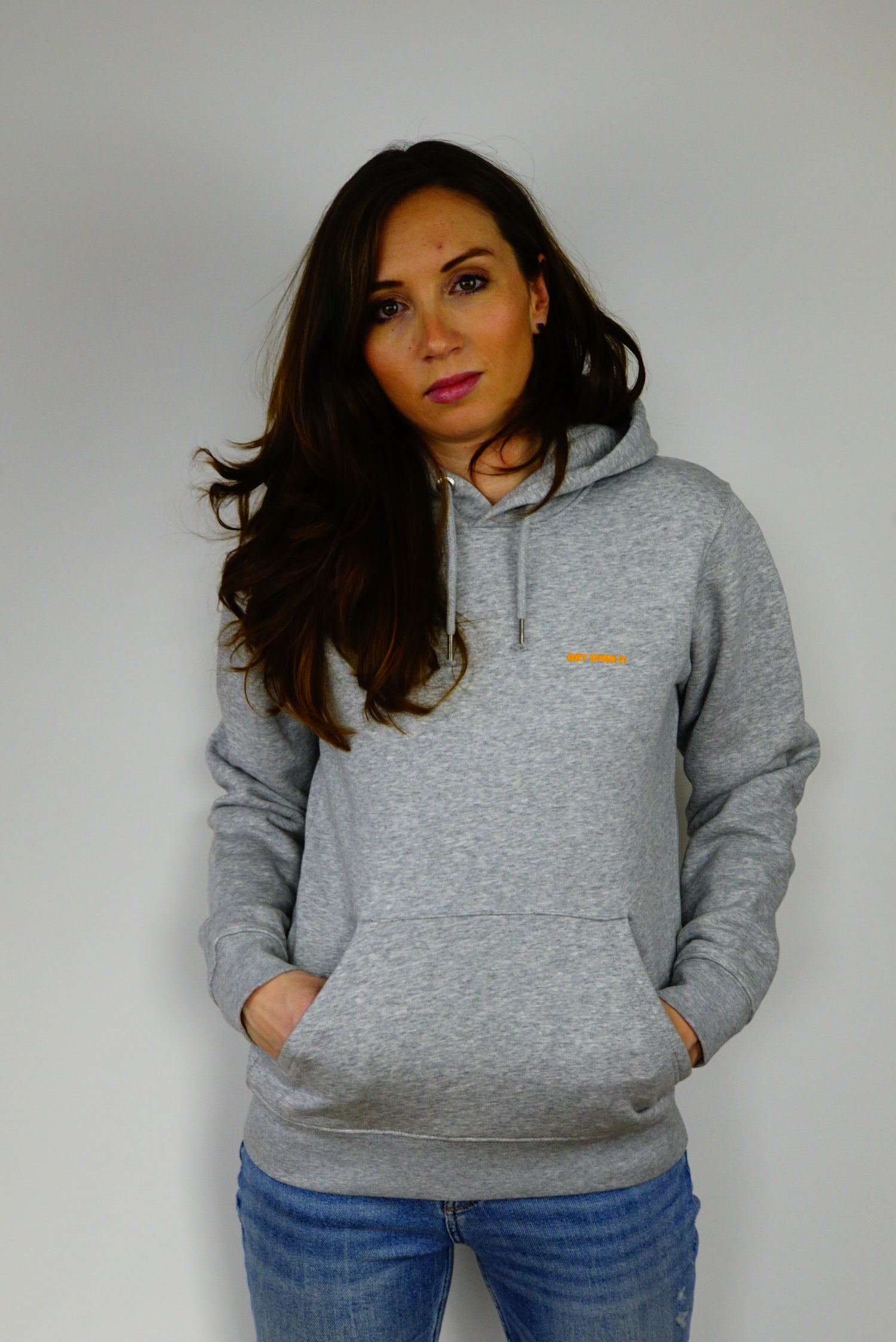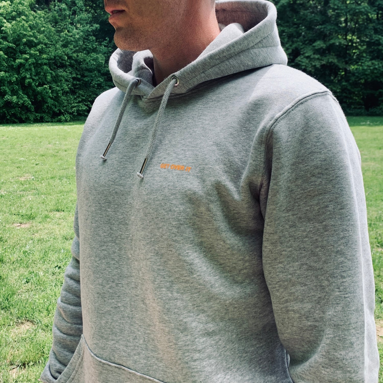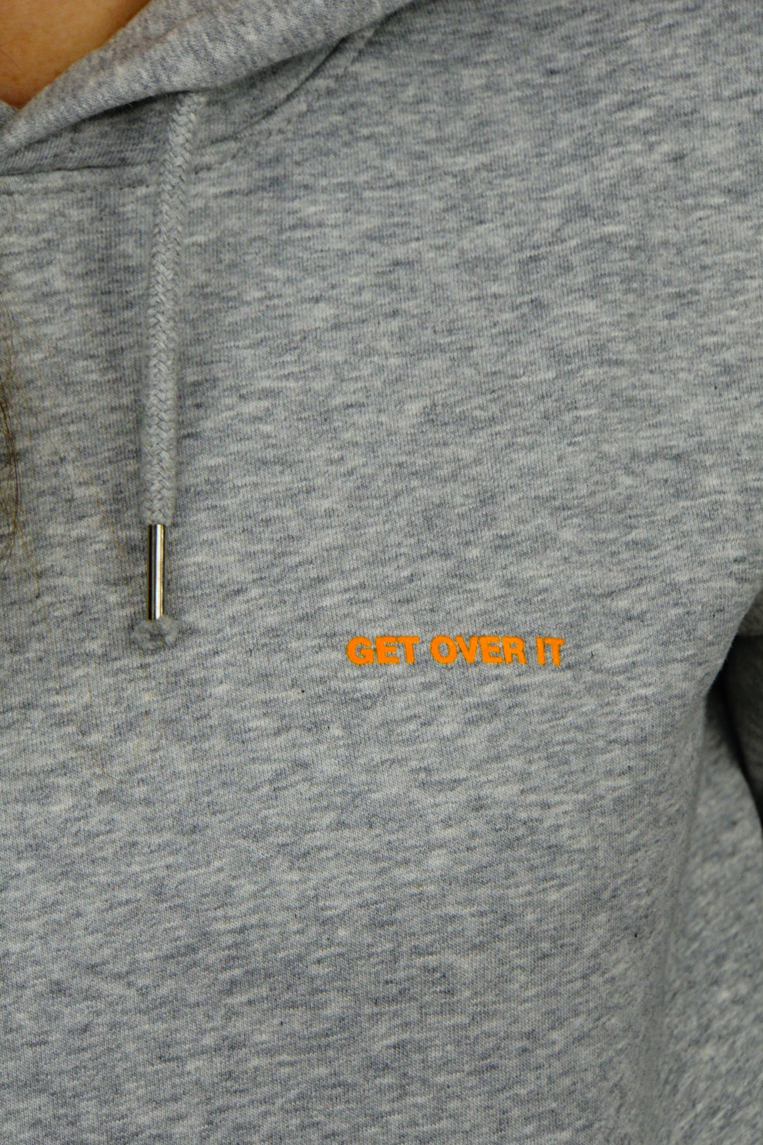 Unser grauer kuscheliger Hoodie mit Siebdruck Print "GET OVER IT" in leuchtendem Orange.