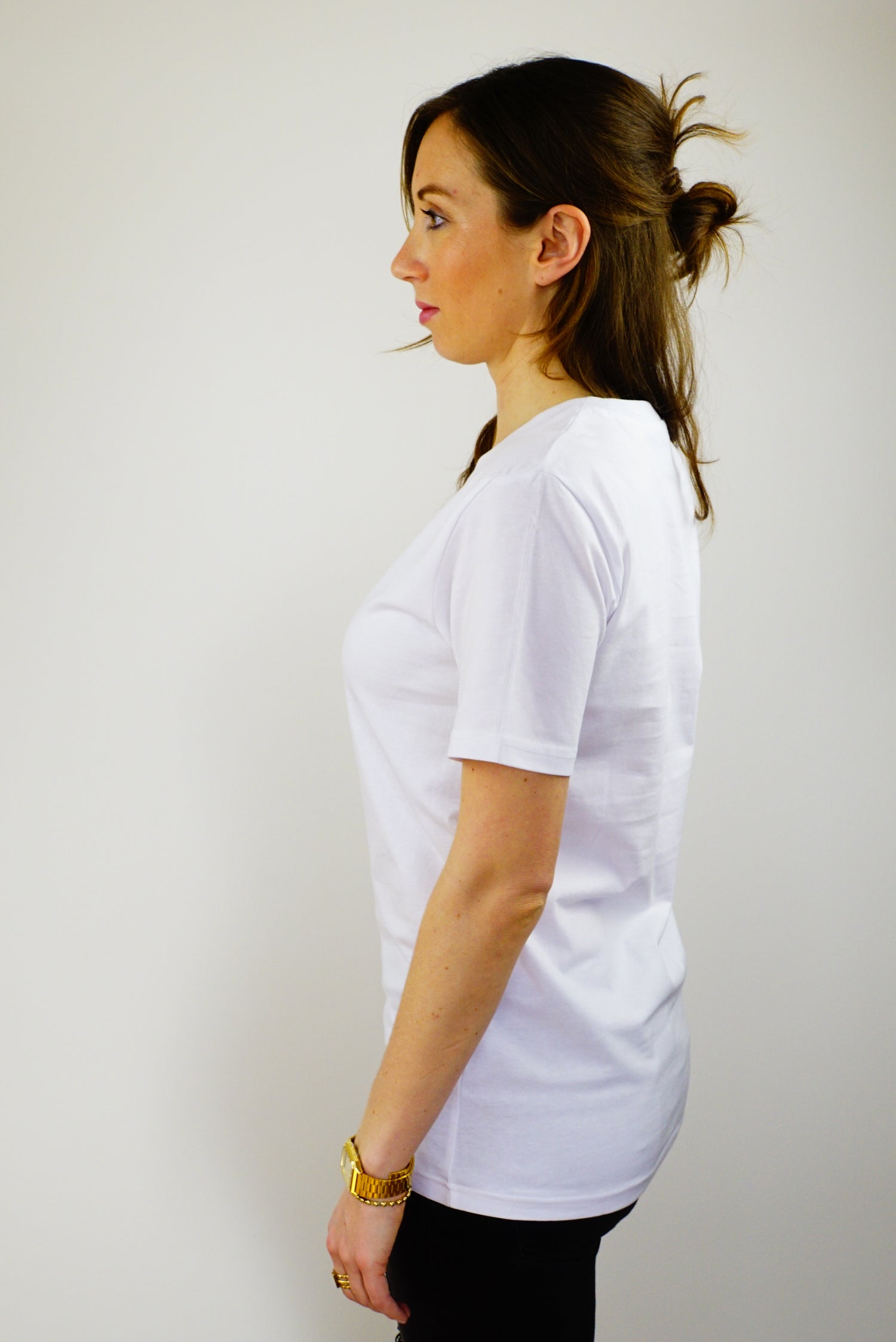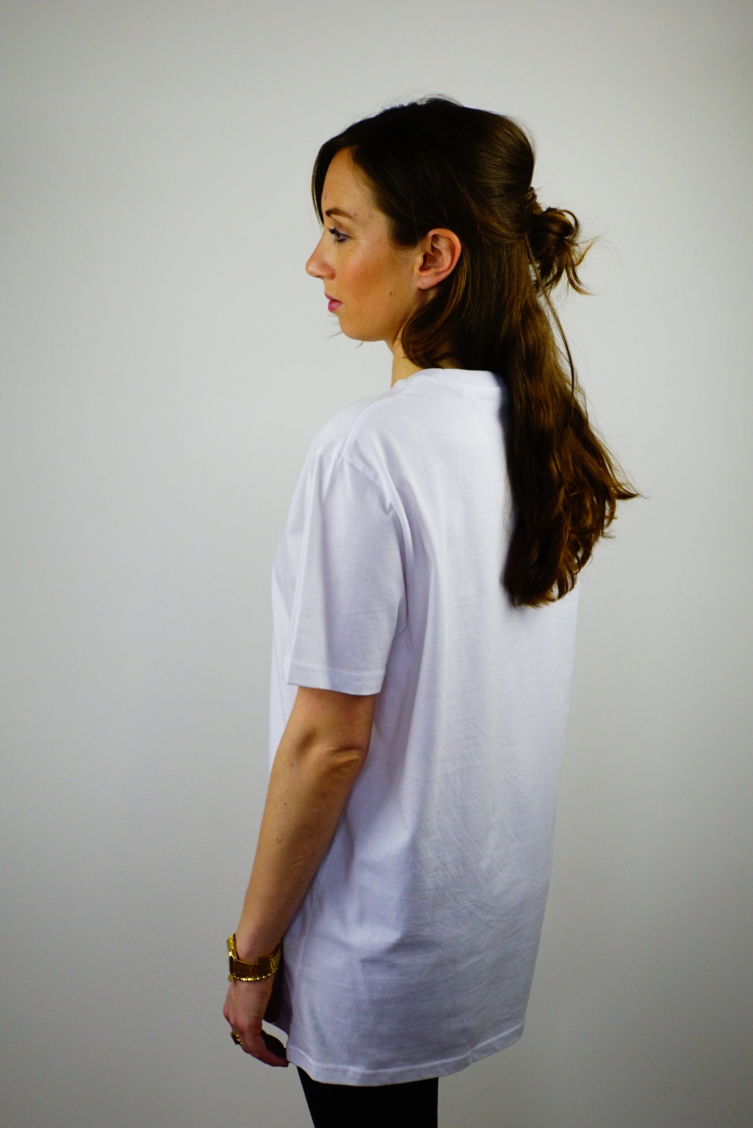Unser weibliches Model ist 1,68m groß und trägt das Shirt in Größe XS und dann im Vergleich noch in Größe M.