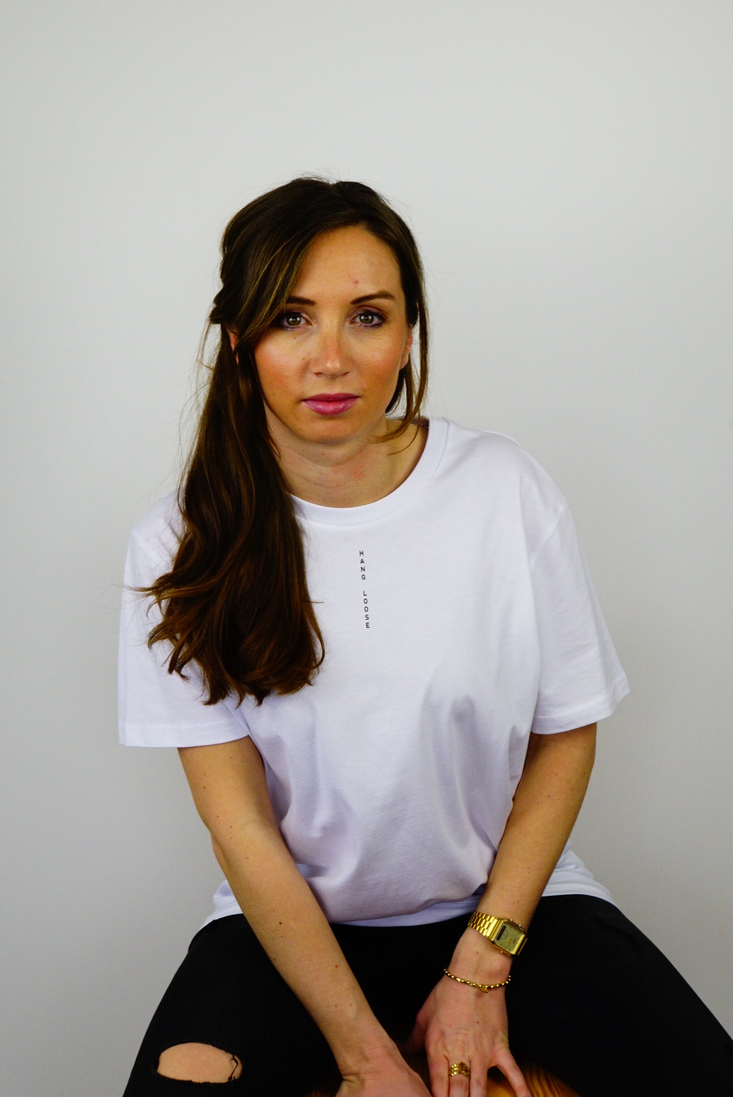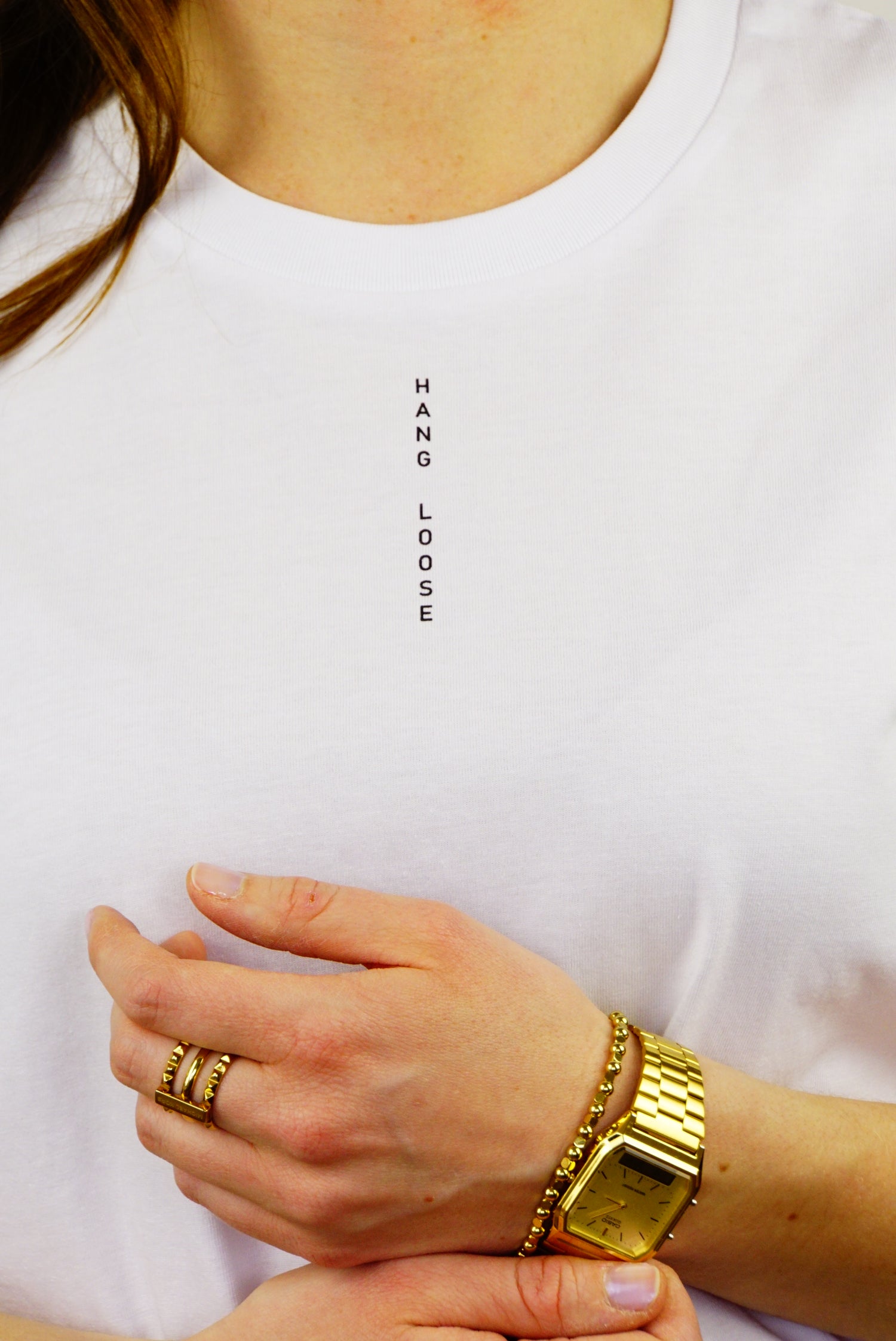 Unser minimalistisches weißes T-Shirt mit Siebdruck Print "HANG LOOSE".