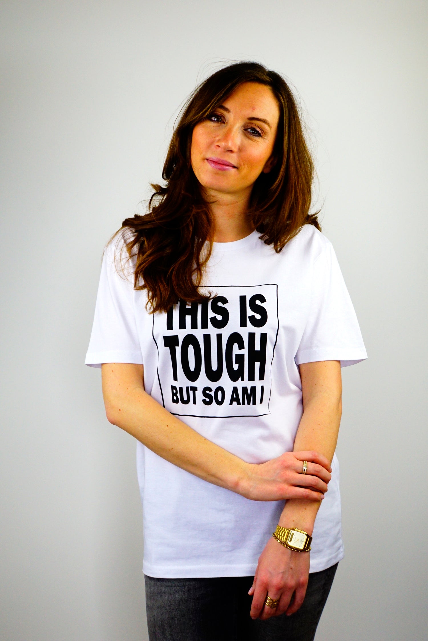 Unser weißes unisex T-Shirt mit Siebdruckprint "THIS IS TOUGH BUT SO AM I".
